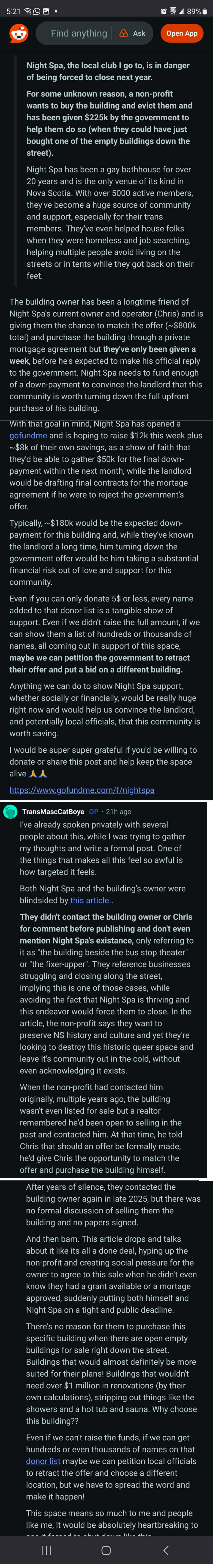 2026-03-07: the owner of the business, Night Spa, Chris Awesome, starts a GoFundMe with a target of $12,000 to help the business buy the building from the landlord (that is, Night Spa buying it instead of CFAT.) Awesome says, "I am good friends with the owner of the building who has agreed to consider making an alternative arrangement so that we can purchase the building instead but we need to raise some money fast for a down-payment."